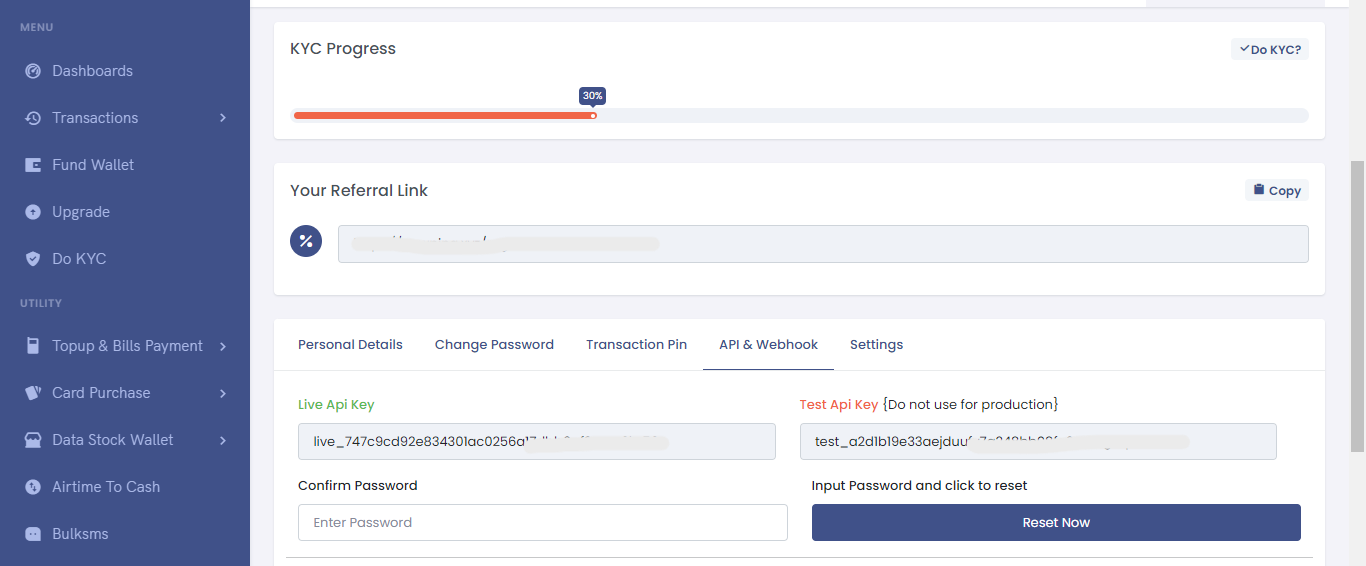 When you sign up for AOAwisepay, your API keys are generated automatically. To obtain your keys, please go to the dashboard, click on the Account Settings link, and look for your API key under the API & Webhook tabs.