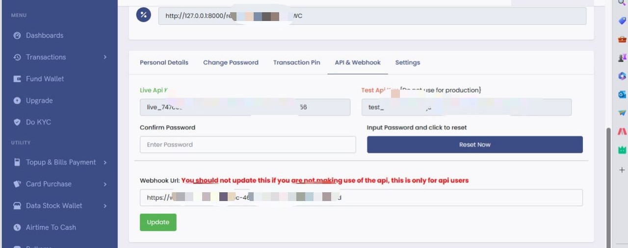 In other to take advantage of webhooks, you will have to first set up a publicly available URL that AOAwisepay can have access to. To set up one, kindly go to your dashboard, click on the Account Settings link and check under the API & Webhook tabs, there, you will find an input box for your webhook.